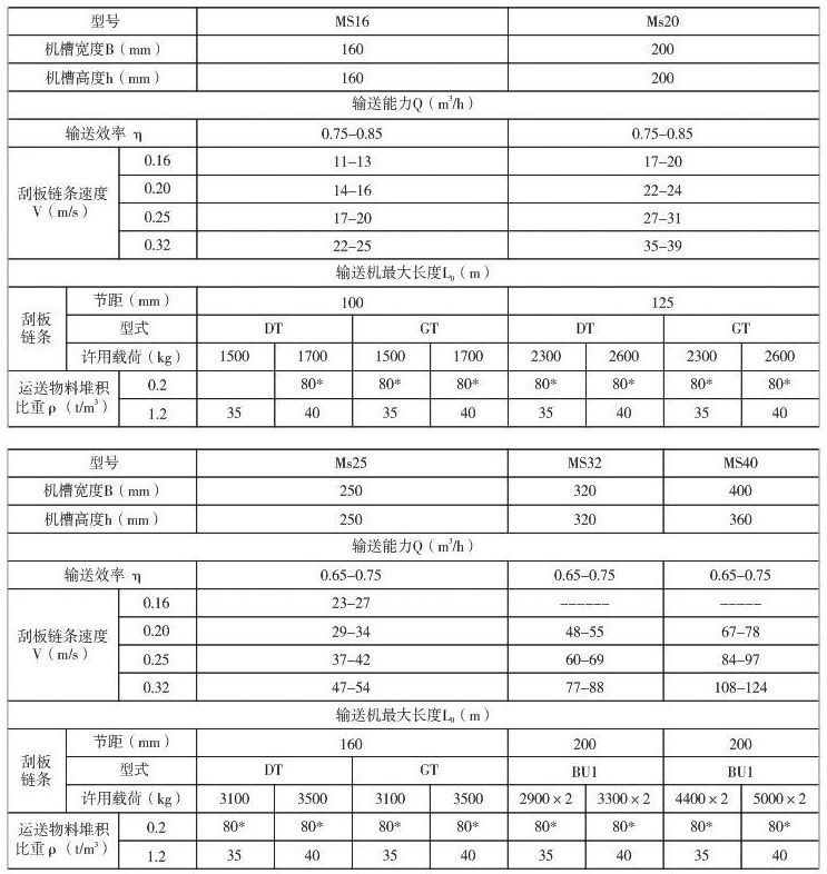 MS型埋刮板輸送機(jī)技術(shù)性能表: